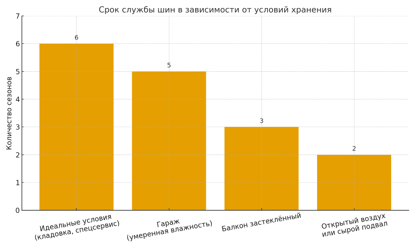 Если подходить к делу грамотно, срок службы шин можно увеличить в два раза. Производители закладывают до 5–6 сезонов эксплуатации, и именно правильные условия хранения позволяют резине «дожить» до этого времени без потерь.